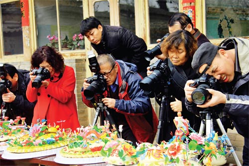 近日,中國民俗網(wǎng)、中國旅游網(wǎng)攝影記者和業(yè)余攝影愛好者30余人聚集在原平市衛(wèi)村面塑藝人趙佩云家中,全程拍攝山西非物質(zhì)文化遺產(chǎn)面塑食品的制作過程。面塑是山西民間喜聞樂見的一種食品,原平市衛(wèi)村面塑藝人趙佩云融合了歷史文化和民間藝術,制作的面塑做工考究,形式多樣,色澤艷麗,受到了人們的追捧,吸引了眾多記者的鏡頭。(吉建平 攝)
