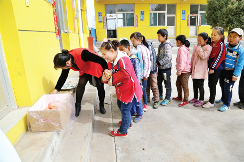 4月12日,在靜樂縣神峪溝鄉(xiāng)張貴村小學,該校學生正在領取免費營養(yǎng)餐。張貴村小學是該縣實施國家農村義務教育階段學生營養(yǎng)改善計劃的學校之一,按照每生每天4元的補助標準,該校每年有4萬余元用于學生加餐補助。(閆曉梅 攝)