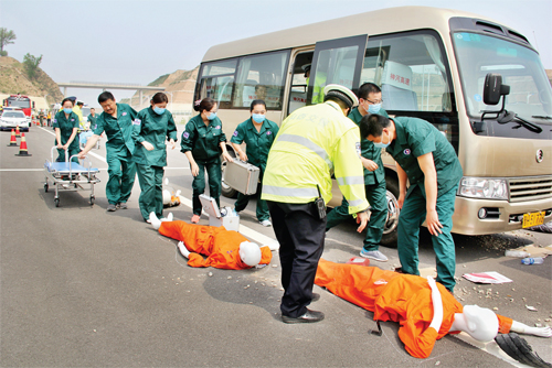 6 月1 日,為了提高對(duì)突發(fā)事件的應(yīng)急處置能力,靈河高速公路神河段建設(shè)管理處聯(lián)合偏關(guān)縣應(yīng)急辦、公安消防大隊(duì)等有關(guān)部門(mén)單位成功舉行了群死群傷重特大交通事故應(yīng)急處置演練。圖為演練現(xiàn)場(chǎng)。(孟建國(guó) 攝)