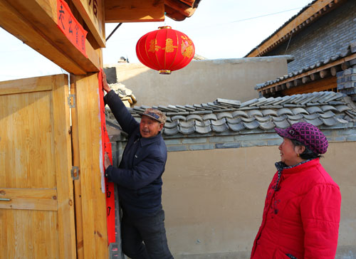 除夕早上,岢嵐縣宋家溝移民新村,沈姚付兩口子正在貼春聯(lián)迎新春。張林平 攝