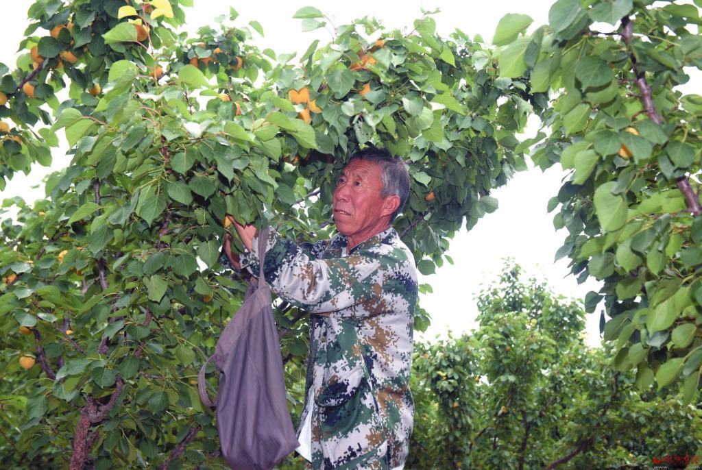 漫山杏黃綴枝頭。近日,定襄縣橫山村龍山莊園迎來杏子豐收季。金燦燦的杏果掛滿枝頭,果香四溢。果農(nóng)穿梭林間,使用“采摘神器”摘取成熟的果實,臉上洋溢著豐收的喜悅。(郭彥蘭 攝)