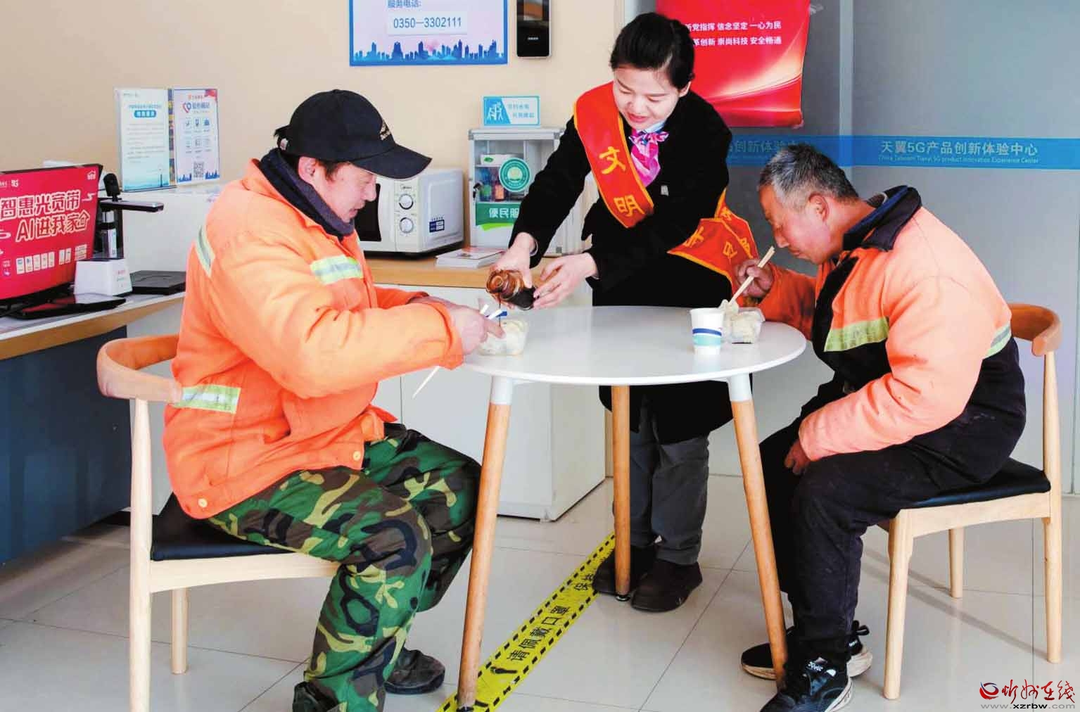 活動(dòng)當(dāng)天,忻州電信各網(wǎng)點(diǎn)“愛心翼站”成為溫馨的“暖心補(bǔ)給站”。“愛心翼站”的志愿者一大早就忙碌起來,精心準(zhǔn)備了熱氣騰騰的餃子和香氣撲鼻的熱茶,他們走出營(yíng)業(yè)廳,熱情地招呼環(huán)衛(wèi)工人:“師傅,今天是冬至,這么冷的天,您辛苦一大早啦,快到咱營(yíng)業(yè)廳里吃些餃子暖和暖和……”環(huán)衛(wèi)工人們一邊吃著餃子,一邊連連感謝,為忻州電信的愛心服務(wù)豎起大拇指。