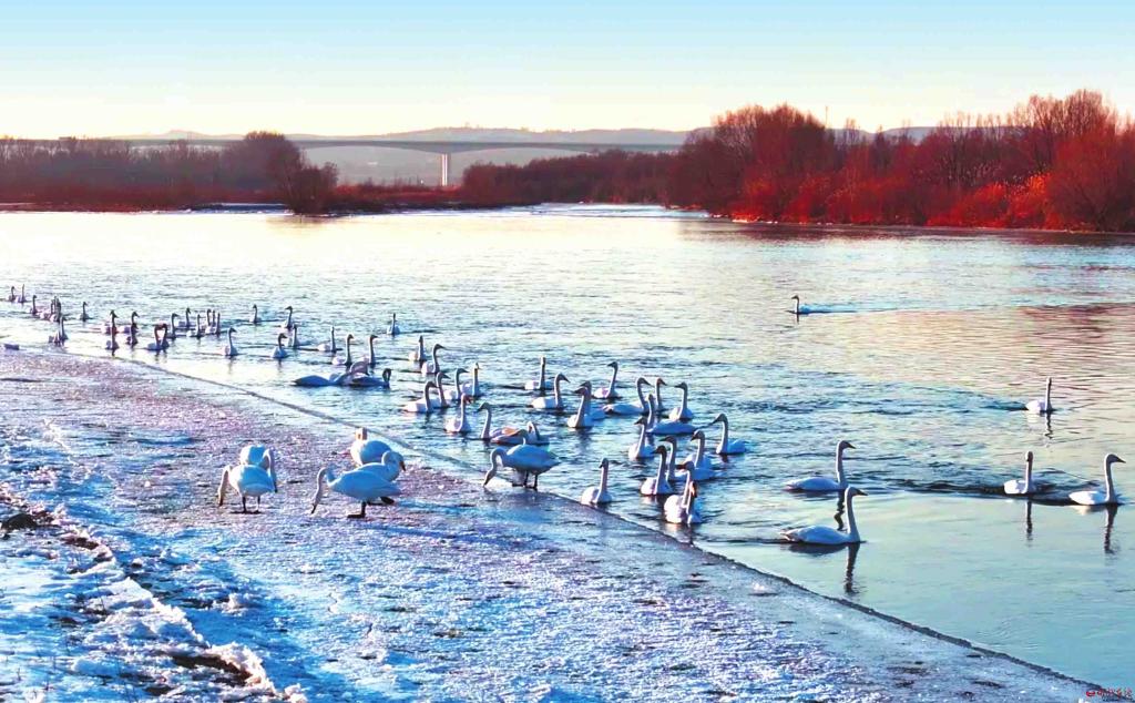 寒冬時節(jié),黃河河曲段迎來最動人的風(fēng)景——湛藍的河面上,潔白的大天鵝如約而至,或翩躚起舞、或振翅嬉戲,為冬日的黃河增添了一抹生機與亮色。(苗吉 攝)