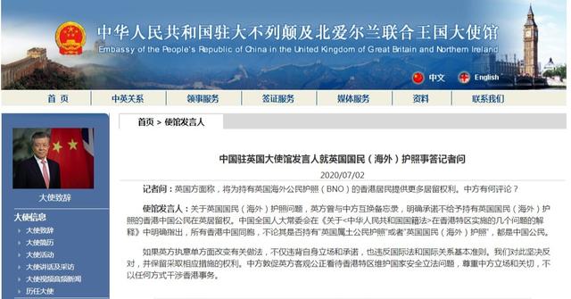 當?shù)貢r間7月2日,中國駐英國大使館發(fā)言人就英國國民(海外)護照事答記者問時表示,關(guān)于英國國民(海外)護照問題,英方曾與中方互換備忘錄,明確承諾不給予持有英國國民(海外)護照的香港中國公民在英居留權(quán)。中國全國人大常委會在《關(guān)于〈中華人民共和國國籍法〉在香港特區(qū)實施的幾個問題的解釋》中明確指出,所有香港中國同胞,不論其是否持有“英國屬土公民護照”或者“英國國民(海外)護照”,都是中國公民。