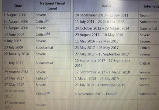 2005年,英國發(fā)生了震驚中外的倫敦地鐵恐襲爆炸案,共造成56人死亡(包括4名恐怖分子)。2006年8月1日起,英國警方開始公開發(fā)布國家安全風險預警,從低到高,一共有5個等級。