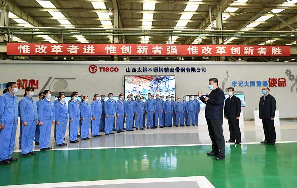 2020年5月11日至12日,中共中央總書記、國家主席、中央軍委主席習(xí)近平在山西考察。這是5月12日上午,習(xí)近平在太鋼不銹鋼精密帶鋼有限公司生產(chǎn)車間考察時(shí),同企業(yè)職工親切交流。 新華社記者 謝環(huán)馳攝