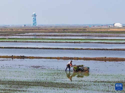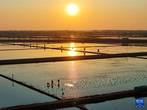 在黑龍江省佳木斯市富錦市的萬畝水稻公園,一塊塊稻田宛若“天空之鏡”,勞動者在“鏡”中插秧作業(yè),與藍天白云、夕陽霞光構(gòu)成壯美的農(nóng)耕圖景。