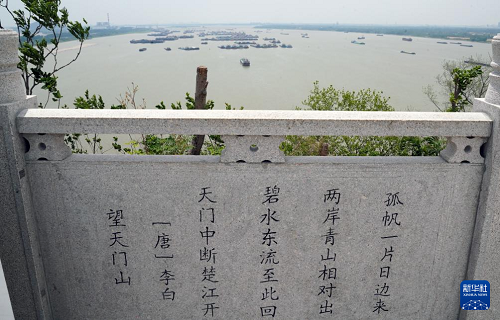 5月13日在天門(mén)山上拍攝的李白《望天門(mén)山》題刻,山下是繁忙的長(zhǎng)江航道。(新華社記者 馬寧 攝)