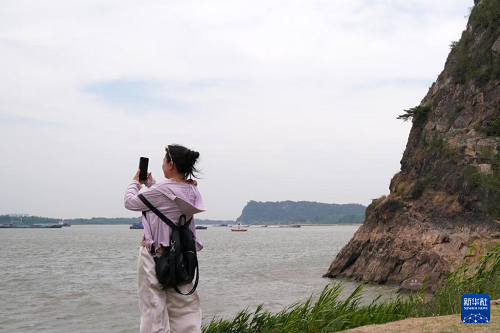 5月13日,游客在天門(mén)山腳下的長(zhǎng)江岸邊拍照。(新華社記者 馬寧 攝)
