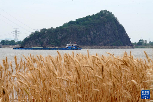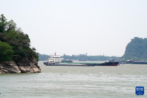 5月13日,貨輪行駛在天門(mén)山旁的長(zhǎng)江航道中。(新華社記者 馬寧 攝)