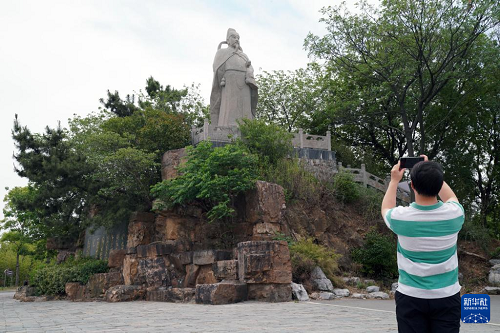 5月13日,游客在天門(mén)山景區(qū)拍攝李白雕像。(新華社記者 馬寧 攝)