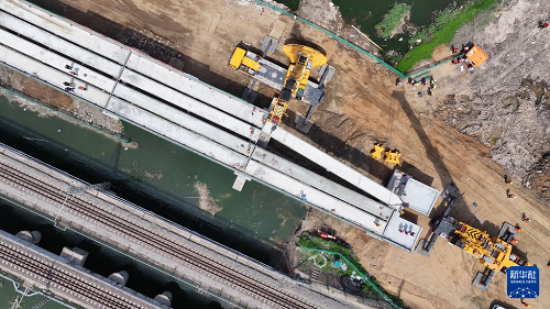 這是5月19日拍攝的沈山鐵路鴨子河中橋新建大橋架梁工程施工現(xiàn)場(無人機照片)。(新華社記者 吳青昊 攝)
