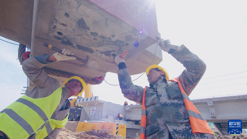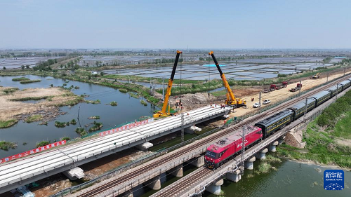 5月19日,工人在沈山鐵路鴨子河中橋新建大橋架梁工程現(xiàn)場施工。(新華社發(fā) 徐鳴禹 攝)
