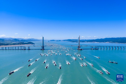 9月16日,漁船駛過(guò)浙江省寧波市象山港大橋開(kāi)赴東海作業(yè)(無(wú)人機(jī)照片)。(新華社發(fā) 張輝 攝)