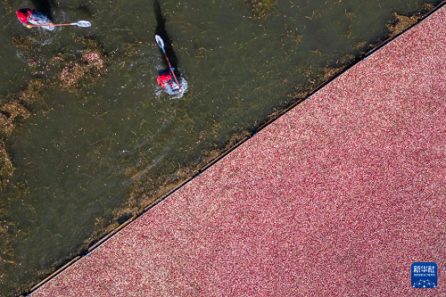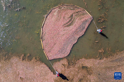 9月21日,在撫遠(yuǎn)市蔓越莓種植基地,工作人員在水中采收蔓越莓(無(wú)人機(jī)照片)。(新華社記者 張濤 攝)