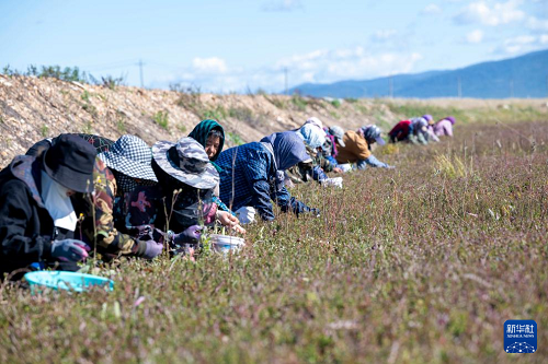 9月21日,在撫遠(yuǎn)市蔓越莓種植基地,工作人員在采收蔓越莓。(新華社記者 張濤 攝)