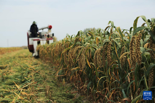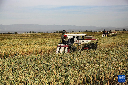 9月24日,收割機在甘肅省張掖市山丹縣位奇鎮(zhèn)暖泉村收割谷子。(新華社發(fā) 陳禮 攝)