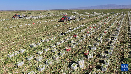 9月23日,菜農(nóng)在甘肅山丹馬場蔬菜基地里收獲蔬菜(無人機照片)。(新華社發(fā) 王超 攝)