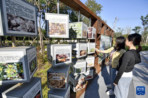 9月24日,市民在順義區(qū)后沙峪鎮(zhèn)的一處林間小型公園內(nèi)觀看中藥材科普畫(huà)廊。(新華社記者 李欣 攝)