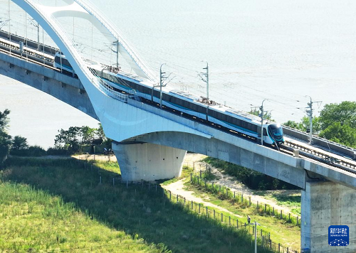 9月29日,列車(chē)駛?cè)霝I??炀€(xiàn)帝封江站(無(wú)人機(jī)照片)。(新華社記者 林善傳 攝)