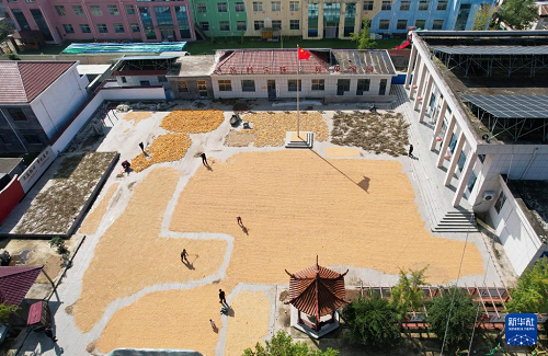 10月14日,農(nóng)戶在山東省臨沂市沂南縣蘇村鎮(zhèn)寶珠村廣場上晾曬糧食(無人機(jī)照片)。(新華社發(fā) 尹君 攝)
