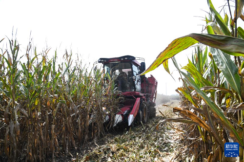 10月14日,河南省濟(jì)源市五龍口鎮(zhèn)農(nóng)民駕駛農(nóng)機(jī)在田間搶收玉米。(新華社發(fā) 苗秋鬧 攝)