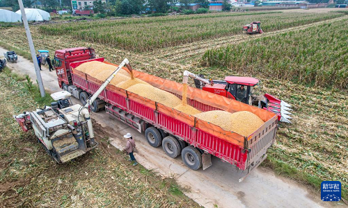 10月14日,在河南省商丘市夏邑縣會亭鎮(zhèn),收割機(jī)將收獲的玉米裝車(無人機(jī)照片)。(新華社發(fā) 王高超 攝)