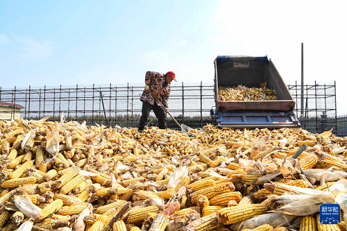10月14日,河南省濟(jì)源市五龍口鎮(zhèn)農(nóng)民晾曬剛收獲的玉米。(新華社發(fā) 苗秋鬧 攝)