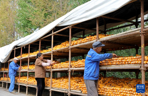 10月14日,在河南省濟(jì)源市軹城鎮(zhèn)中王村,村民將收獲的玉米上架晾曬。(新華社發(fā) 段二平 攝)