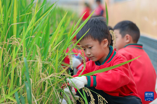 10月15日,云南省曲靖市陸良縣大莫古鎮(zhèn)中心幼兒園的孩子們?cè)谛?nèi)勞動(dòng)基地體驗(yàn)打稻穗。(新華社發(fā) 王勇 攝)