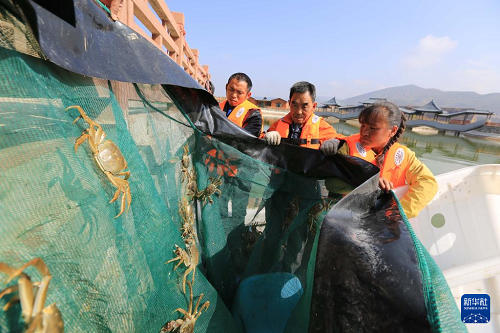 10月27日,在甘肅省定西市安定區(qū)魯家溝鎮(zhèn),工人捕撈大閘蟹。(新華社發(fā) 王克賢 攝)