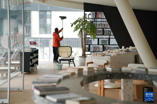 10月29日,在鎮(zhèn)坪縣牛頭店鎮(zhèn)國慶村,一家山居酒店工作人員在酒店書吧內(nèi)打掃衛(wèi)生。(新華社記者 邵瑞 攝)