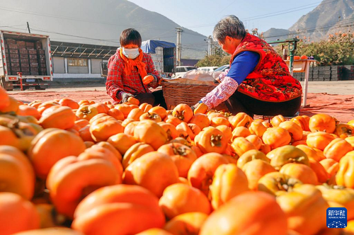 11月1日,河北省遵化市娘娘莊鎮(zhèn)蘆各寨西山村農(nóng)民在場(chǎng)院挑選柿子。(新華社發(fā) 劉滿倉 攝)