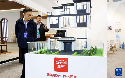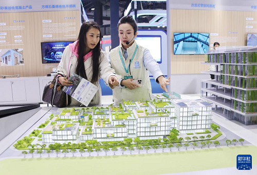 11月6日,參觀者在住博會(huì)上觀看展出的一體化民居模型。(新華社記者 潘旭 攝)