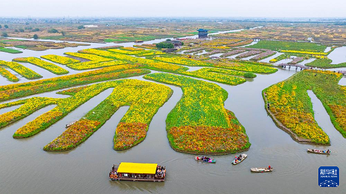 11月10日,游客在江蘇省興化市千垛景區(qū)乘船游玩(無人機(jī)照片)。(新華社發(fā) 周社根 攝)