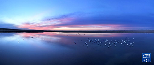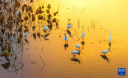 在甘肅省酒泉市阿克塞哈薩克族自治縣,白鷺在冬不拉水庫棲息覓食(無人機(jī)照片,11月9日攝)。(新華社發(fā) 高宏善 攝)