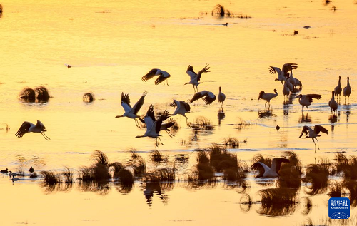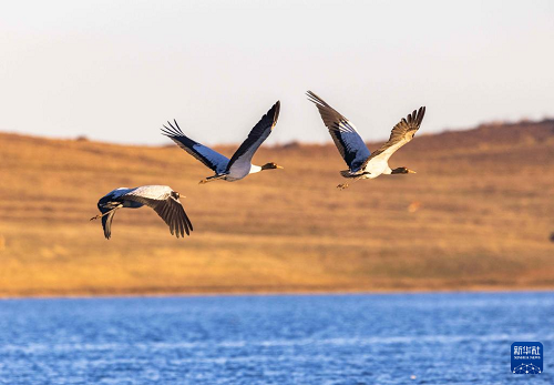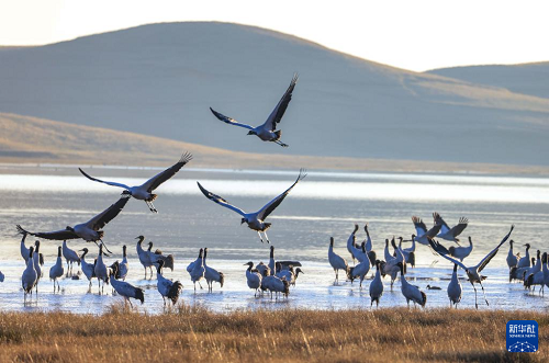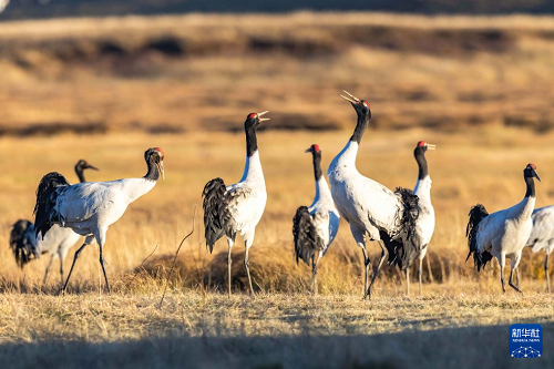11月29日,黑頸鶴在大山包黑頸鶴國家級自然保護區(qū)內(nèi)的大海子濕地飛舞。(新華社發(fā) 陳熙 攝)
