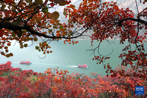 12月7日,船只行駛在紅葉映襯下的長(zhǎng)江三峽巫峽段。(新華社發(fā) 王忠虎 攝)