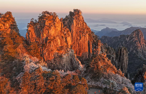 12月14日,游客在安徽省黃山風(fēng)景區(qū)欣賞雪后日出美景(無人機照片)。(新華社發(fā) 施亞磊 攝)