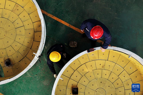 12月16日,在山東青島中青林集團(tuán)有限公司生產(chǎn)車間,工人在安裝攪拌機(jī)襯板(無人機(jī)照片)。(新華社發(fā) 王海濱 攝)