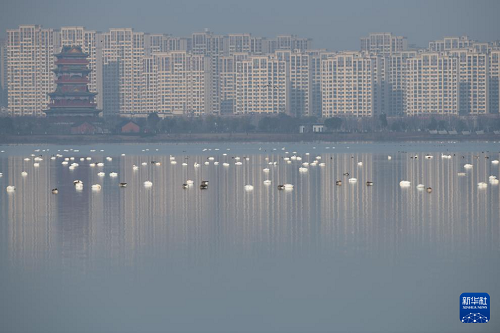 進(jìn)入冬季,成群的候鳥(niǎo)飛抵安徽省滁州市明湖公園,在此休憩、覓食。明湖公園是一座融合自然景觀與人文景觀的城市公園,優(yōu)良的水質(zhì)、豐茂的水草和豐富的魚(yú)蝦資源,使這里逐漸成為天鵝等越冬候鳥(niǎo)和各種鳥(niǎo)類的棲息地。