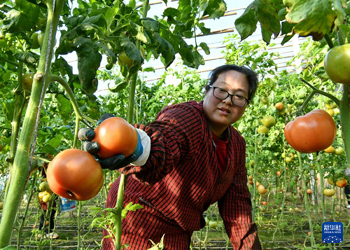 12月29日,肅寧縣萬里鎮(zhèn)一家蔬菜種植合作社的社員在大棚內(nèi)采摘西紅柿。(新華社記者 楊世堯 攝)