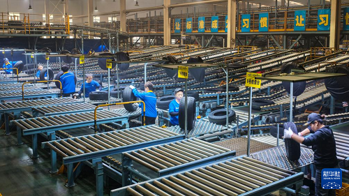 1月4日,在山東省東營市廣饒縣大王鎮(zhèn)的一家橡膠輪胎企業(yè),工人們對橡膠輪胎進(jìn)行外觀檢查(無人機(jī)照片)。(新華社發(fā) 劉云杰 攝)