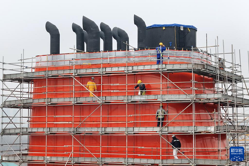 1月4日,在山東煙臺黃渤海新區(qū)一家造船企業(yè),工作人員對一座大型船舶的船體模塊進(jìn)行質(zhì)量檢查(無人機(jī)照片)。(新華社發(fā) 唐克 攝)