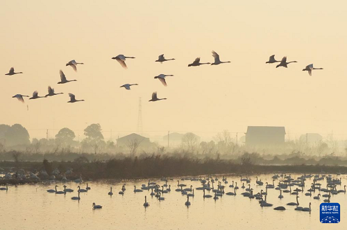 1月14日,越冬候鳥在湖南省岳陽市屈原管理區(qū)東古湖濕地上空翱翔。(新華社發(fā) 曹正平 攝)