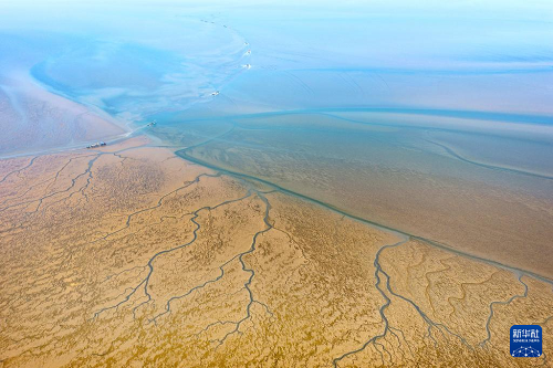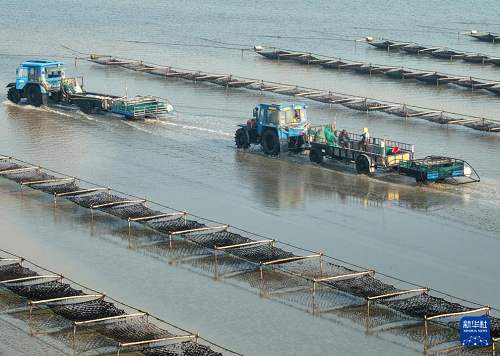 1月15日,養(yǎng)殖戶駕駛拖拉機(jī)趁著退潮出海采收紫菜(無人機(jī)照片)。(新華社發(fā) 徐書影 攝)