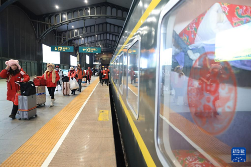 1月19日,國際旅游團(tuán)的外籍游客在哈爾濱站登乘K7041次“東北民俗”主題列車。(新華社發(fā) 徐率 攝)