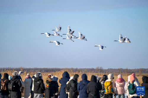 1月21日,游客在黑龍江扎龍國家級自然保護區(qū)內(nèi)觀看丹頂鶴。(新華社記者 張濤 攝)