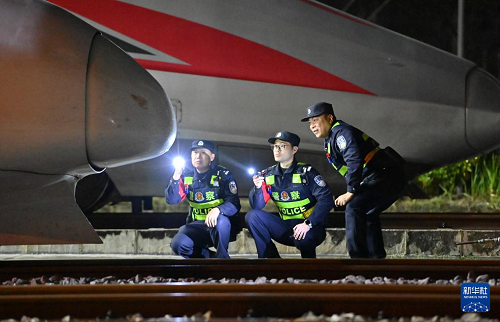 2月2日凌晨,南寧鐵路公安局南寧公安處長崗嶺站派出所民警在南寧動車所檢查列車安全情況。(新華社記者 陸波岸 攝)