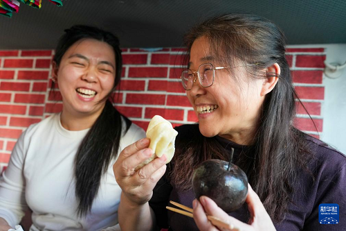 2月4日,在K7103次“列車大集”臥鋪車廂內(nèi),旅客在品嘗凍梨和煎餅。(新華社記者 王松 攝)